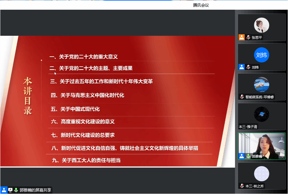 宣讲从党的二十大的重要意义开始讲起,带领我们明确二十大的主题、主要成果,重温过去五年的工作和新时代十年伟大变革,感悟马克思主义中国化时代化,体会中国式现代化,引导师生党员认识到高度重视文化建设的意义,了解新时代文化建设的总要求及具体举措,启发广大师生党员更具责任感与使命感。
