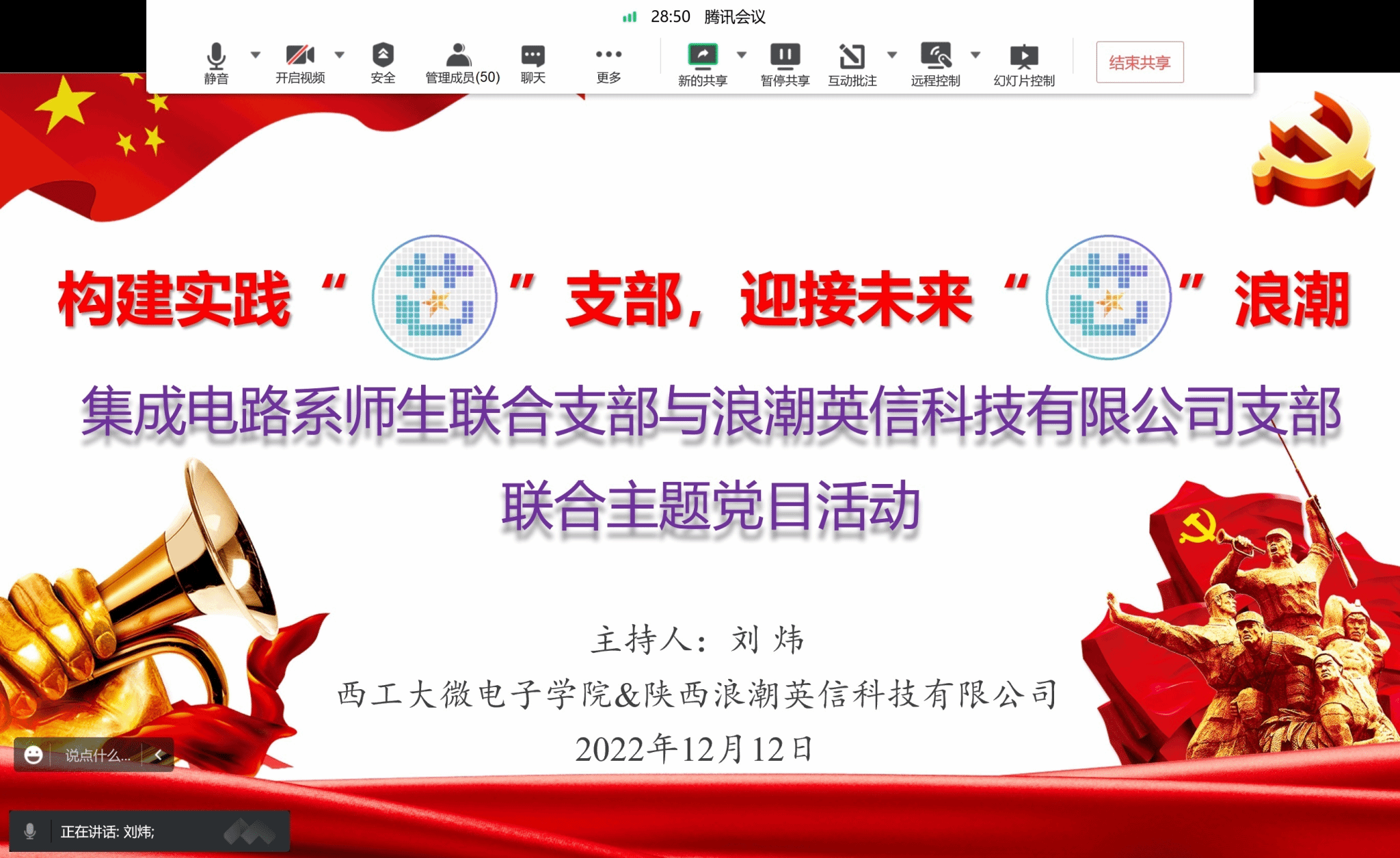 集成电路系师生联合支部与陕西浪潮英信科技有限公司支部以“构建实践‘芯’支部,迎接未来‘芯’浪潮”为题,通过腾讯会议平台,举办了一次线上联合主题党日活动。本次活动由支部书记刘炜同志主持。活动开始后,主持人刘炜同志首先介绍了举办此次支部联合主题党日活动的背景和意义,以及参加本次活动的行业资深专家、集成电路系教师代表,以及硕博士研究生党员等主要参会人员情况。