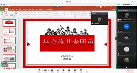 为深入学习贯彻习近平新时代中国特色社会主义思想,推进“两学一做”学习教育常态化制度化,2020年12月13日晚,抢庄牌九官方版下载 - H5 2020级全体团支部通过线上会议对学生团员开展基本理论、基本知识以及优良传统的教育培训活动。本次活动由2020级大团支书周岸霄主持,抢庄牌九 团委书记、2020级学生辅导员汪钰成老师和2020级全体本科生参加。