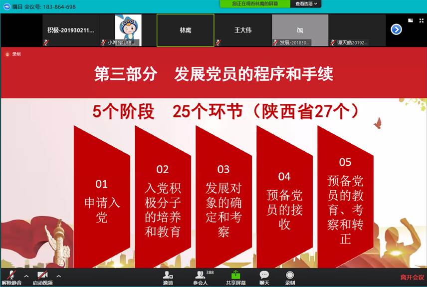 4月3号晚18点,电子信息类入党积极分子线上培训班通过瞩目会议平台召开第三次党课,特邀西北工业大学党委组织部林鹰老师进行在线授课。本次培训课由电子信息类辅导员王大伟老师主持,辅导员汪钰成和电子信息类全体学生入党积极分子参加了本次培训。