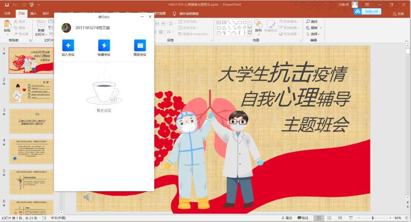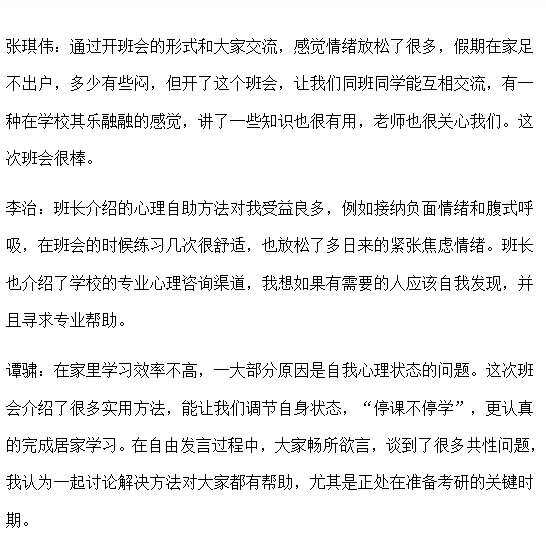 17021703班“安心定志,你我同行”主题班会上,小班长首先通过疫情期间的心境反应介绍了心理自助的主要方法,包括接纳负面情绪、不恐慌、保证合理睡眠,腹式呼吸法等,同时对抢庄牌九 专业心理援助的渠道以及如何识别是否需要援助进行了详细说明,使同学们受益良多,对如何科学做好“停课不停学”、集中注意力认真学习以及如何做好心理自我防护有了更深入的了解。最后,在班主任王昆老师的组织下,大家相聚云端,依次讲述自己的居家学习生活体会,遇到有困难问题的学生,全班同学共同献计献策、共同克服困难。这场班会不仅促进了师生间的交流互动,更促进了学风班风建设,增强了班级凝聚力。