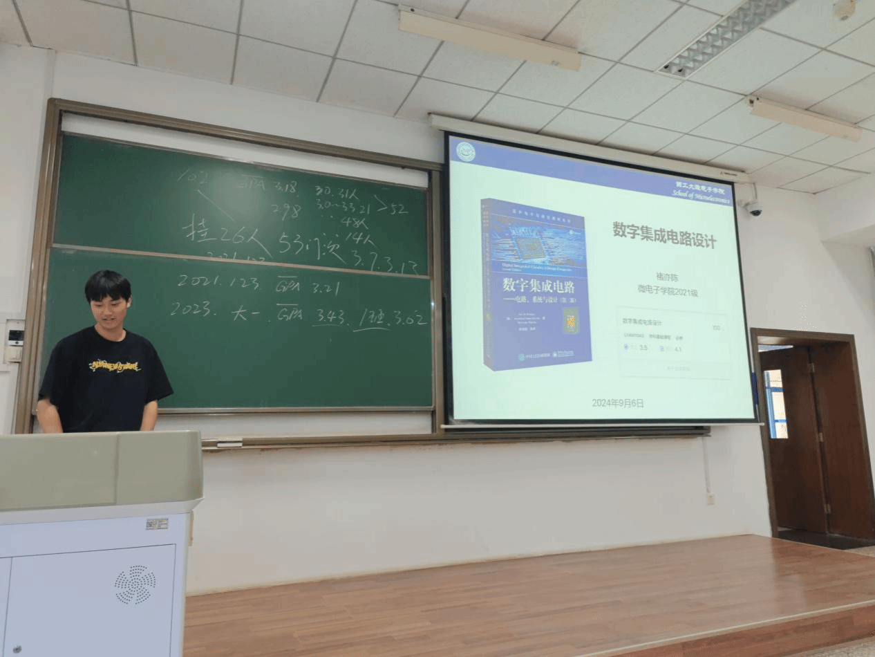 褚亦陈则重点讲解了《数字集成电路设计》,介绍了部分章节的内容和重点,深入浅出的讲解令2022级的同学受益匪浅。同时,褚亦陈根据自己在集创赛方面的经验分享了数集在竞赛中的重要意义,指出课程的学习是为学科竞赛和科研训练打好基础。