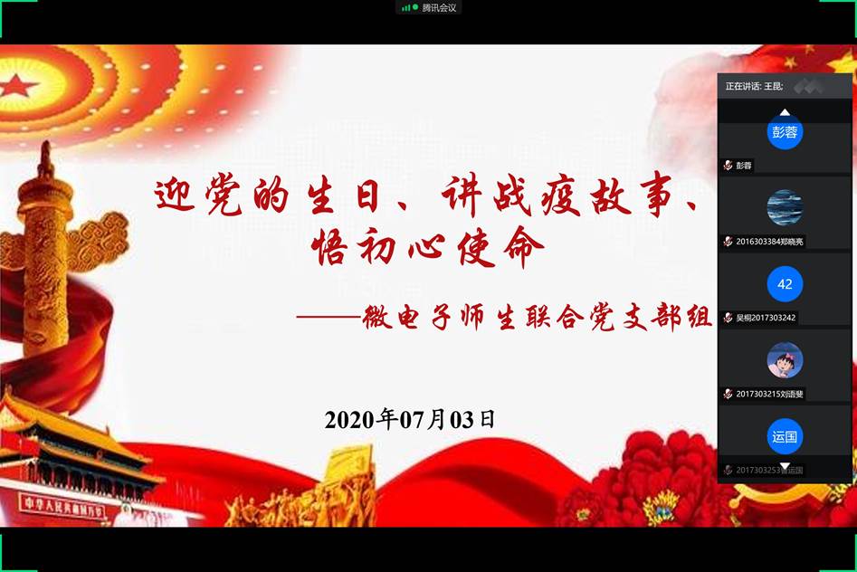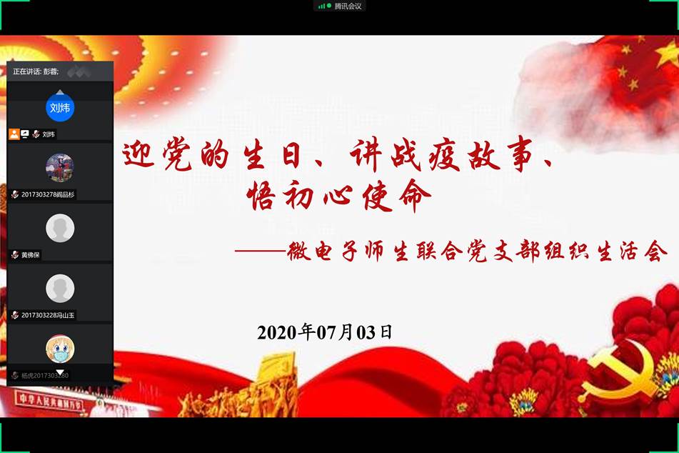 微电子师生联合党支部利用腾讯会议平台,在线开展了“迎党的生日、讲战疫故事、悟初心使命”的专题组织生活会。抢庄牌九