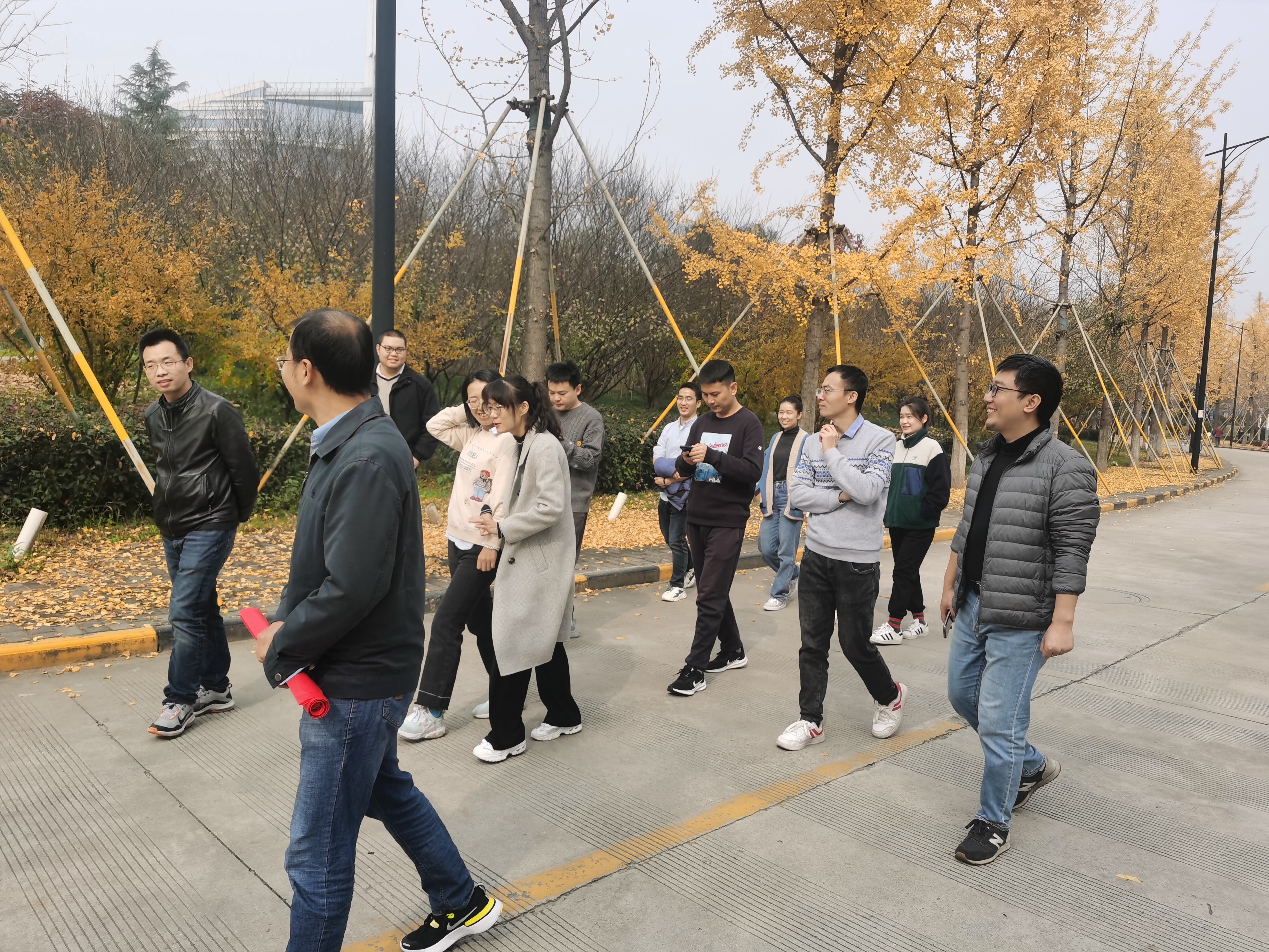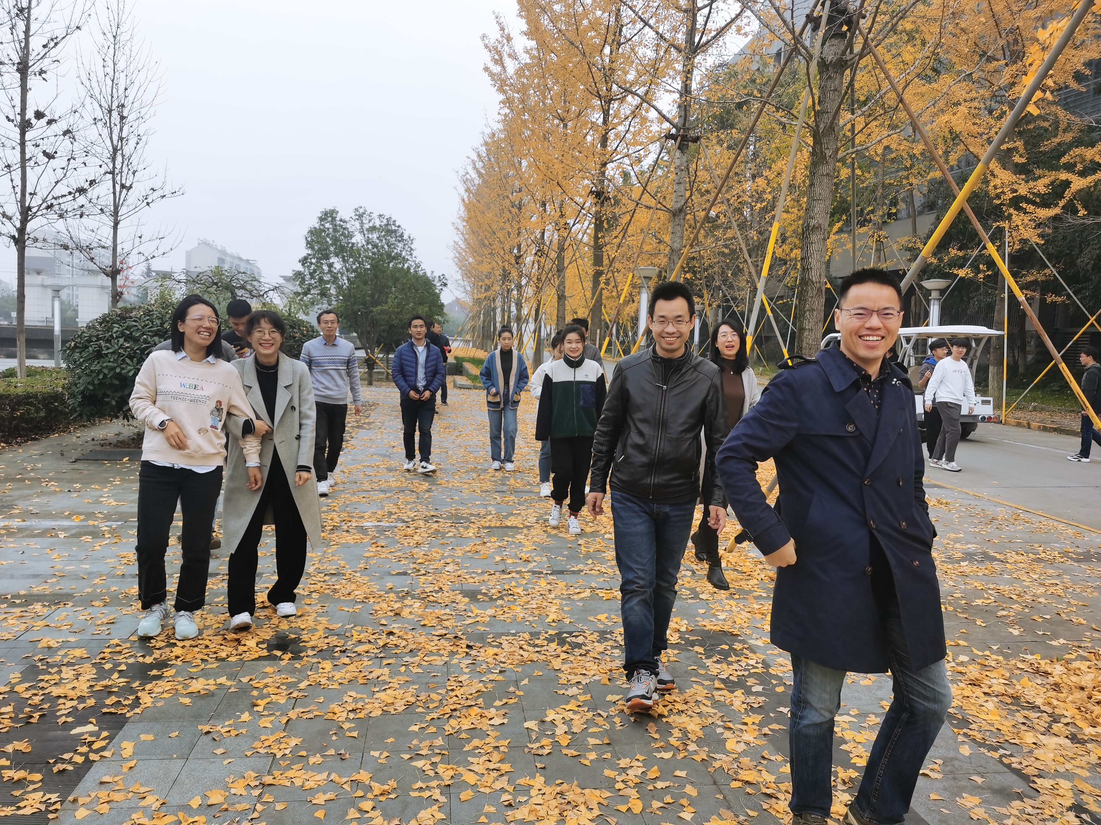 大楼、校园湖泊漫步。秋季的校园,点点阳光照耀,片片黄叶飞舞,湖泊里的鱼儿自由自在地遨游,大家边走边聊,在教学、科研工作繁忙之际,享受惬意、悠闲的时光。