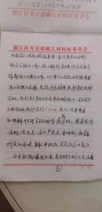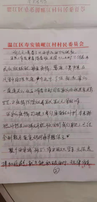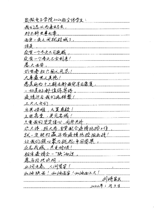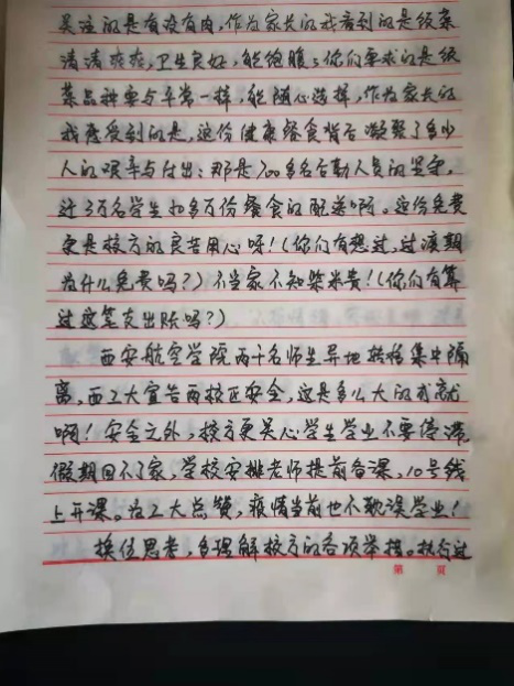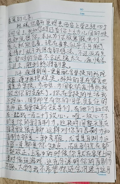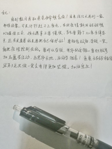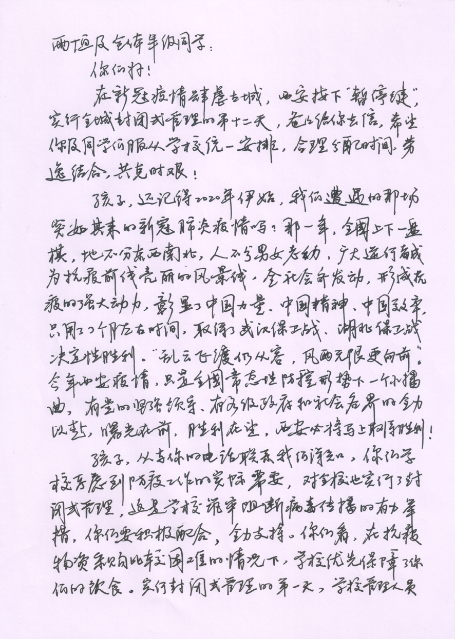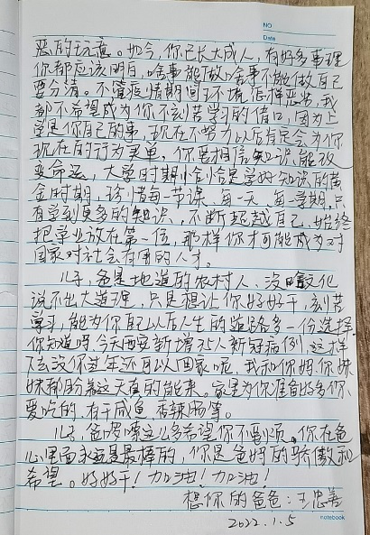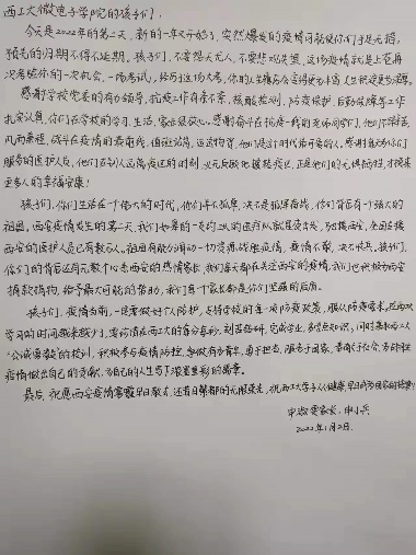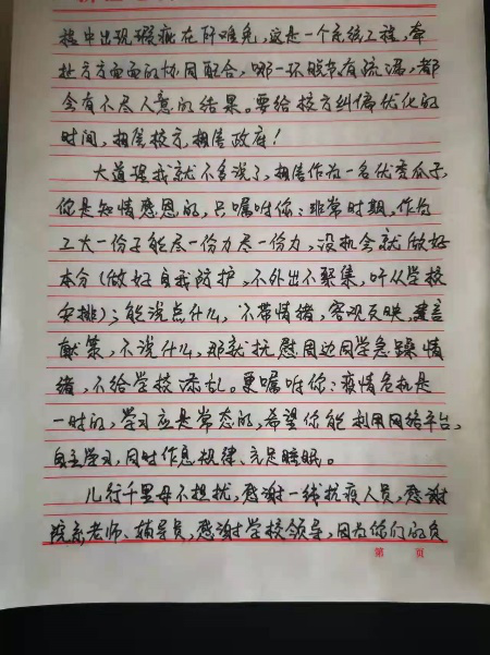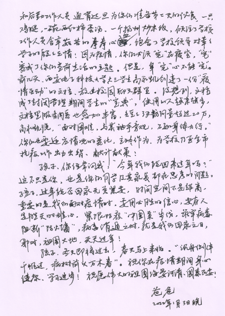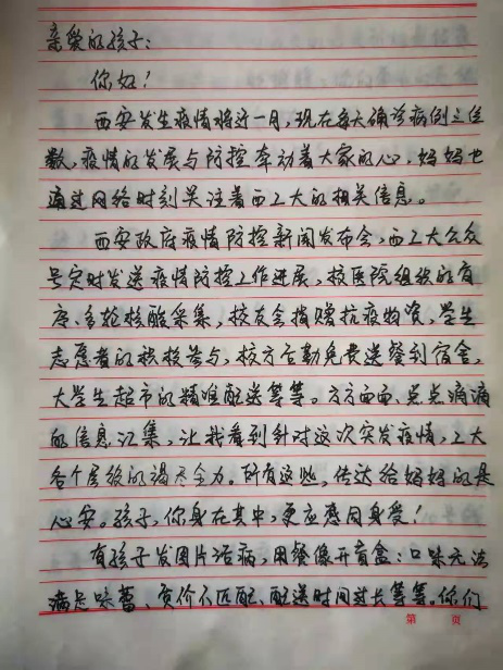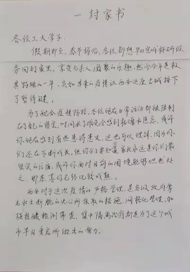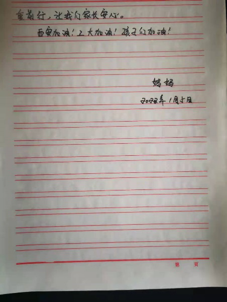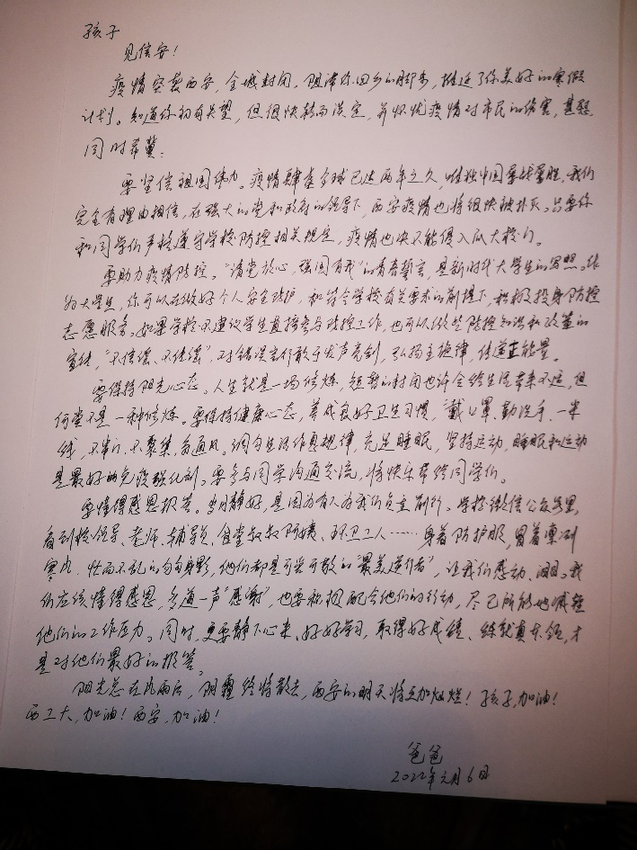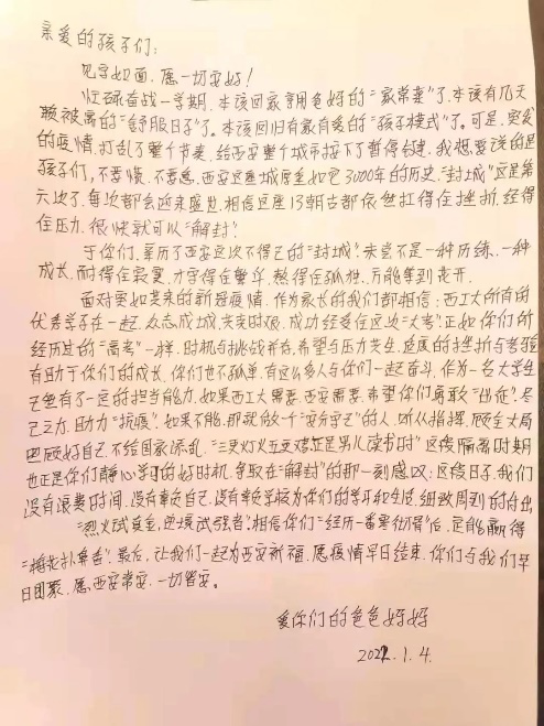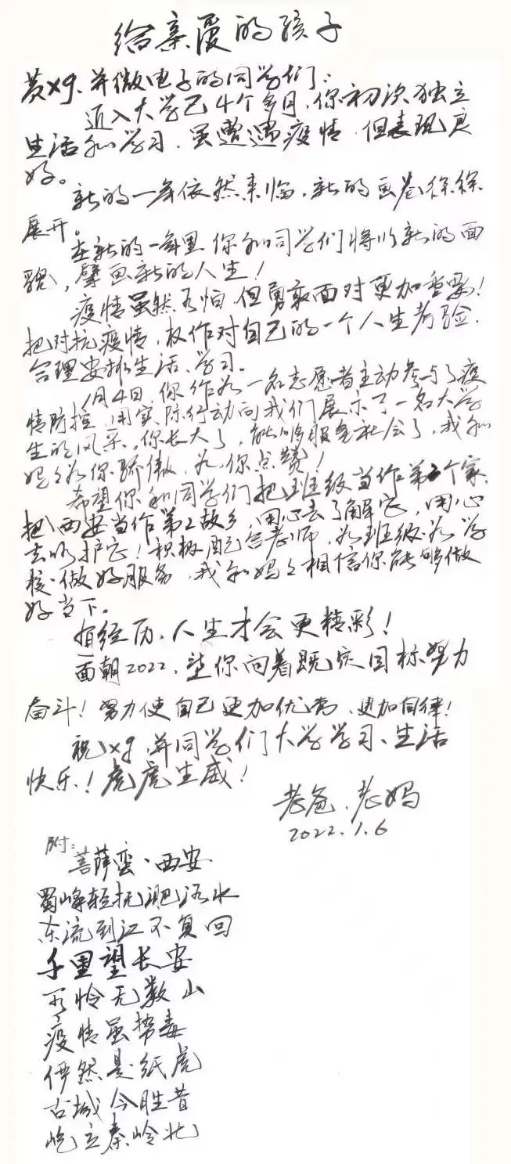 进行宿舍封控管理。得知这个消息,远在家乡的亲人们也关心着我们。从大一年级到博士生,许多同学的家长都提笔写下了一封家书,用这种特殊的形式表达对孩子的嘱托、思念、期盼和祝福。让我们一起品读家书中所包含的浓浓亲情,共同期盼疫情过去后的春暖花开。