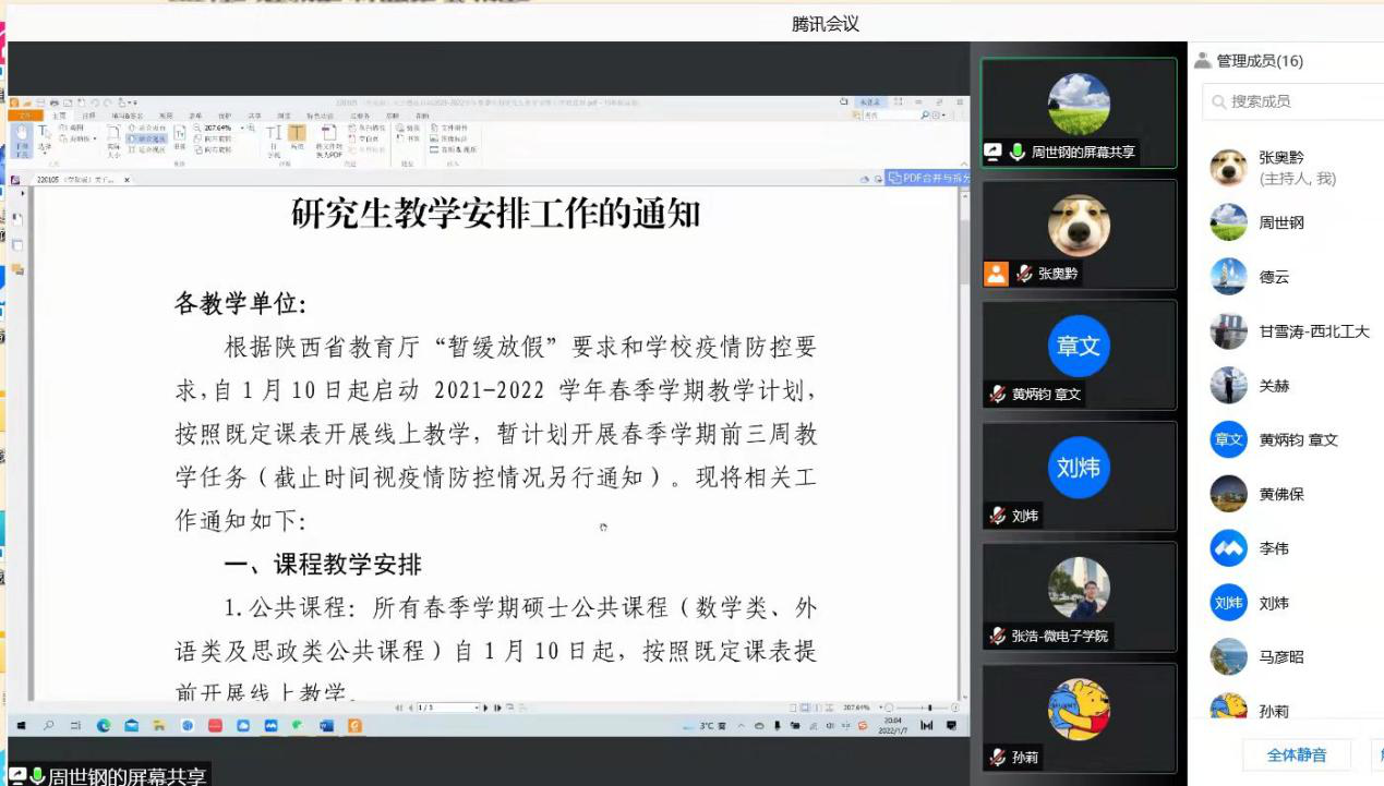 在疫情期间共开设4门研究生课程,目前已完成排课和学生选课工作,前期准备工作已就绪。周世钢副院长指出任课教师在进行线上授课时,始终要贯彻立德树人根本任务、落实课程思政情况,保证教学的效果和质量。其次,强调导师作为研究生培养的第一责任人,在疫情期间可制定措施保障研究生学业的顺利开展,建议导师利用新媒体方式做好对研究生的思想引导、学术指导、科研训练等工作,通过微信群、QQ群开组会的方式,与所指导研究生谈话交流,全面掌握学生身心健康、学业及科研状况,并做好疫情期间学生焦躁情绪的安抚工作,确保学生能够按期并保质保量的完成学业。