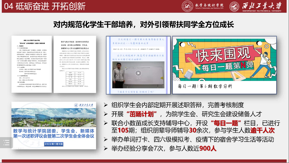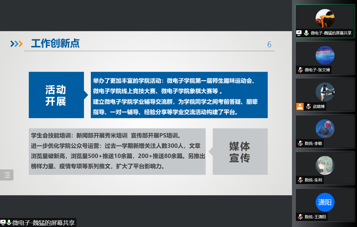 学生会工作的创新点,包括组织学生会内部定期开展述职答辩、开展“茁旸计划”、开设“每日一题”栏目、举办经验分享会、在传承旧有校级活动的同时开展创新文体活动等。