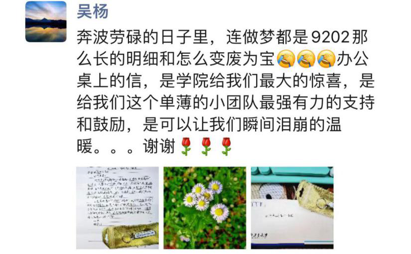 你们好,今天下午我们收到了微你们送来的感谢信和小礼物,下午办公室有点忙碌,所以没有好好感谢一下同学们,帮我们转达一下谢意。非常感谢同学们的心意,特别特别的温暖。之前做的工作,能让同学们认可和支持,我们也很开心。这份心意也让我们更加有动力,我们会继续为同学们做好保障工作。再次感谢可爱的同学们,还有抢庄牌九