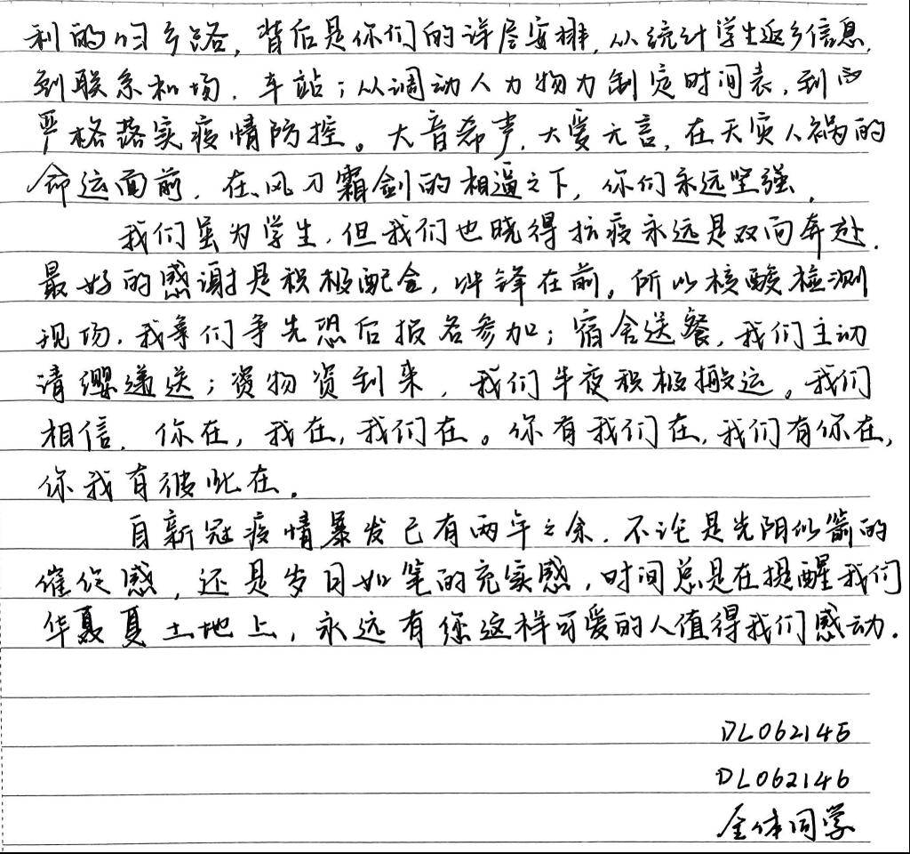 举办“感君抗疫举,致信报春归”感恩活动。DL062145和DL062146班的12名学生代表来到西北工业大学学生工作部及团委,向疫情防控持久战中在台前幕后不辞辛劳、默默付出的老师们,亲手递上精心制作的明信片以及手写信件,寄情于纸,表达深深的敬意与由衷的感谢。
