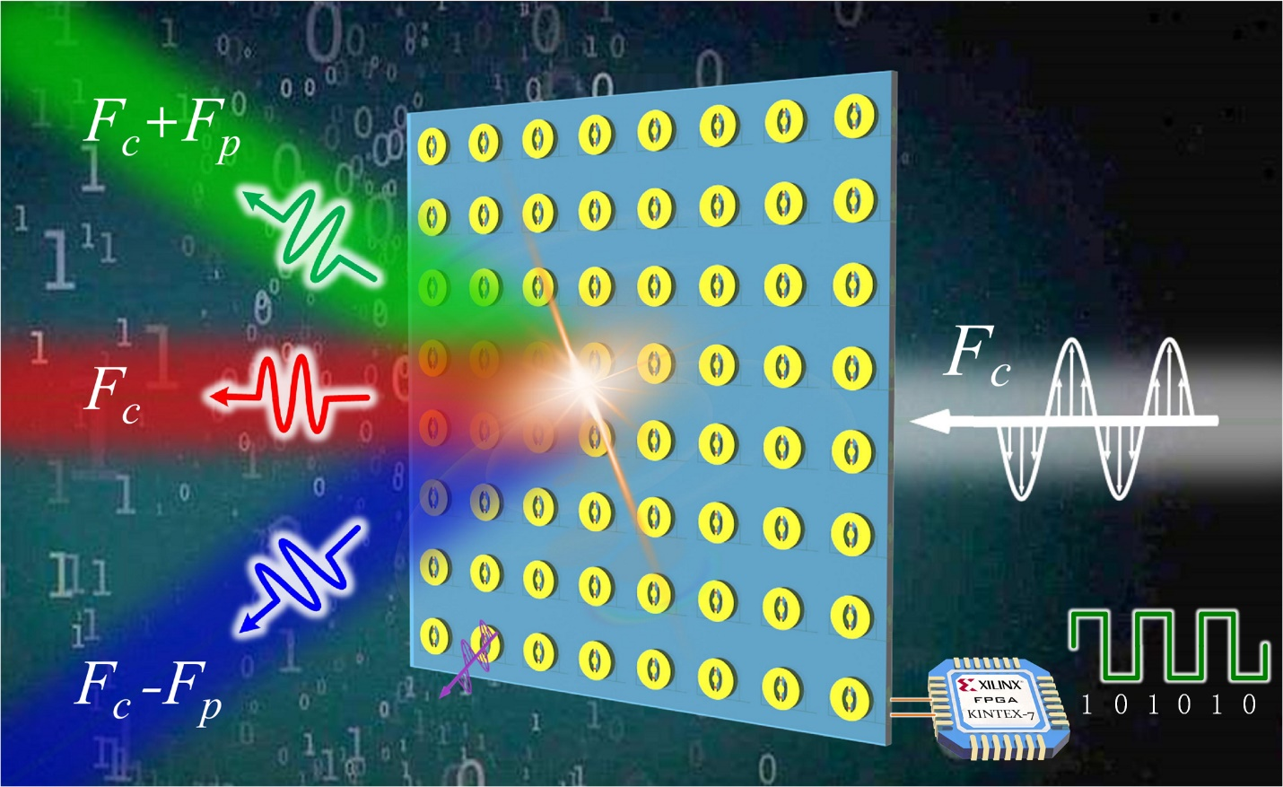 聚焦上述关键问题,研究团队开展了基于时间调制透射式数字超表面的动态高精度电磁调控方法研究,将时间调制阵列原理与一比特透射式数字超表面相结合,利用FPGA对数字超表面单元进行周期性时序调制来激励产生谐波分量,通过时间维度编码间接完成对谐波分量的高精度相位控制,获得了等效六比特的高相位精度,实现了基于透射式数字超表面的低副瓣动态波束扫描和高精度波束指向控制,研究成果在星载保密及抗干扰通信等场合具有较好的应用前景。