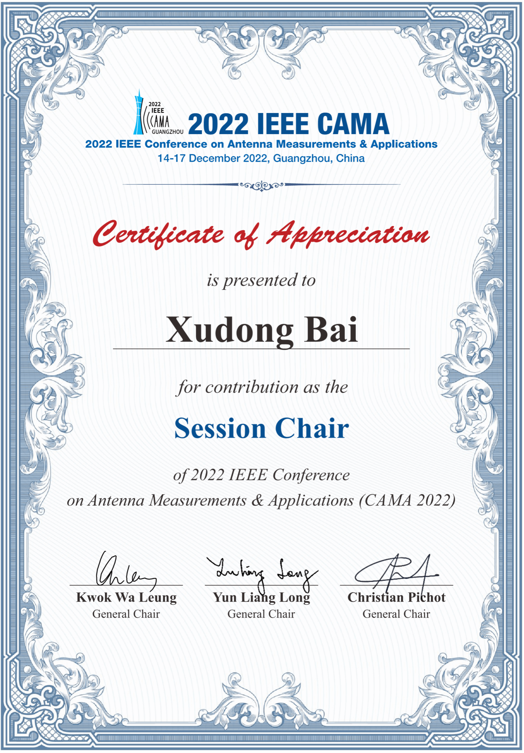 白旭东老师除日常的科研工作外,还积极参与各类公共服务工作,在ement & Application (2022 IEEE CAMA)上担任了分会场Reconfigurable Metamaterials / Metasurfaces and Applications主席,并做了题为《Dynamic Beam-Scanning Through Radiation-Type Programmable Metasurface》的学术报告。同时,积极参与抢庄牌九