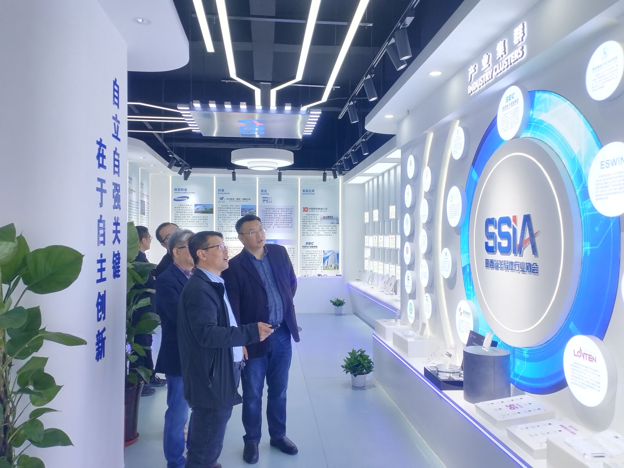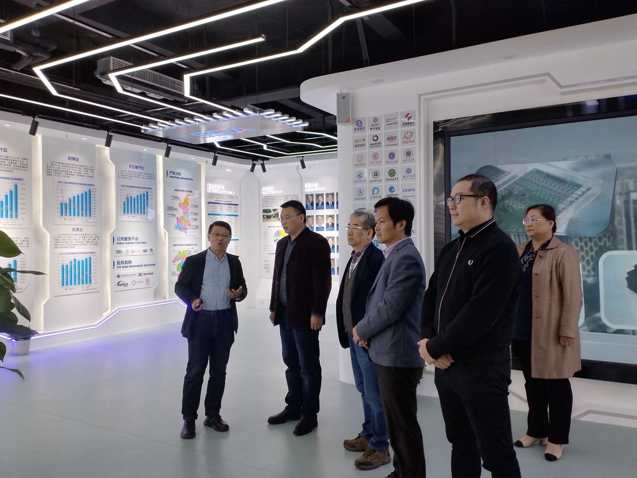 访问开始,马炳和一行参观陕西半导体产业展厅,详细了解陕西省半导体产业的发展历程、产业链重点企业、技术创新成果以及产业未来展望。