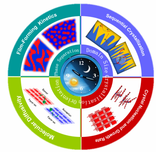 太阳能电池的基本结构包括阴极、阳极、相应的界面层及活性层,其中活性层形貌对器件性能有着重要影响。然而,由于活性层中给体与受体分子在成膜过程中结晶存在竞争耦合;此外,活性层的结晶和相分离往往同时发生,导致形貌可控性差。针对上述问题,该论文从活性层形貌调控角度切入,详细介绍了课题组近年来在有机太阳能电池活性层形貌调控相关工作,并阐述了通过结晶动力学路径优化活性层形貌的策略。通过将动力学因素与热力学因素相结合,在全聚合物、聚合物/非富勒烯小分子及全小分子共混体系实现了活性层相分离结构、相区尺寸、结晶度及分子取向的精细调控,并建立了活性层形貌与器件性能之间构效关系,为制备高性能器件奠定了基础!